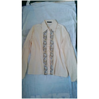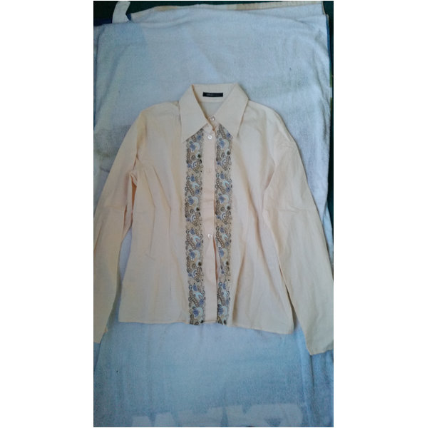 Bluse s.Oliver women beige mit buntem Band Druck vorne Länge ca 62 cm Unterarm einfach ca 55 cm