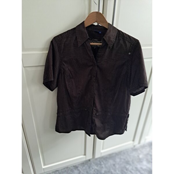 Hübsche braune Bluse mit weißen dünnen Streifen und kurzen Ärmel.Kragen.Knopfleiste und an den Seiten jeweils ein Schlitz.In der Taille ist ein Band um die Weite zu verstellen.