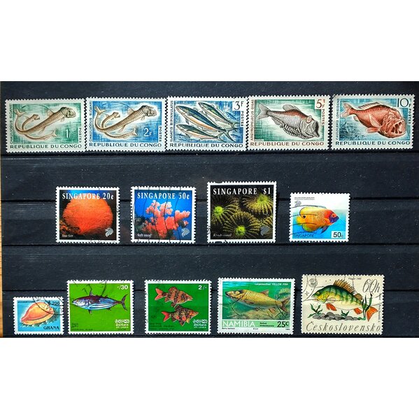14 Briefmarken mit Fisch- und Korallen-Motiven