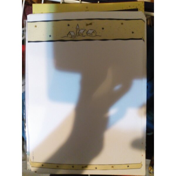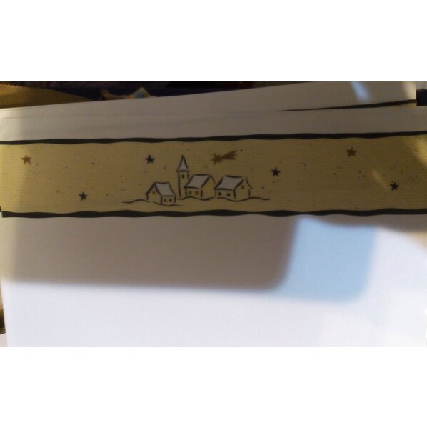 Bei diesem Briefpapier gab es einen Transportschaden - die linke obere Ecke von jedem Blatt in diesem Karton (der Deckel ging auf dem Transport ganz verloren) ist gestaucht worden. Unten links ist das Logo von Sigel auf jedes Blatt gedruckt. Das Papier ist nur einseitig bedruckt, oben mit einem gelben Streifen von 4 cm breite mit hellgelbem Hintergrund und goldenem Druck: Ein paar Häuser, eine Kirche und Sterne. Den Stern, der die Geburt Christi zeigte, sieht man deutlich bei diesem Weihnachtsbriefpapier. Die Sterne sind unten in einem schmalen gelben Streifen wiederholt. Es ist drucker- und kopiertaugliches Sigel-Papier. Natürlich kann man es auch mit der Hand beschreiben.