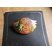 Die Brosche ist auf einer schön gestalteten schwarzen Pappkarte befestigt, auf der der Namen der Künstlerin vermerkt ist.