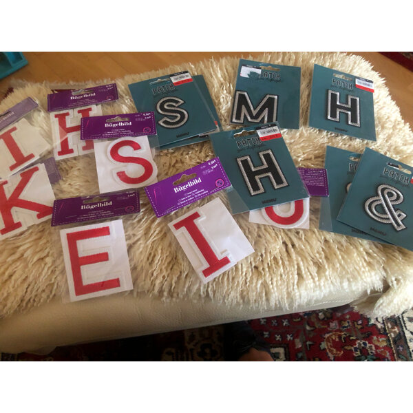 14 verschiedene Groß Buchstaben zum Aufbügeln oder Aufnähen, S mehrmals, H mehrmals, K 1x, I 1x,U 1x, M 1x,