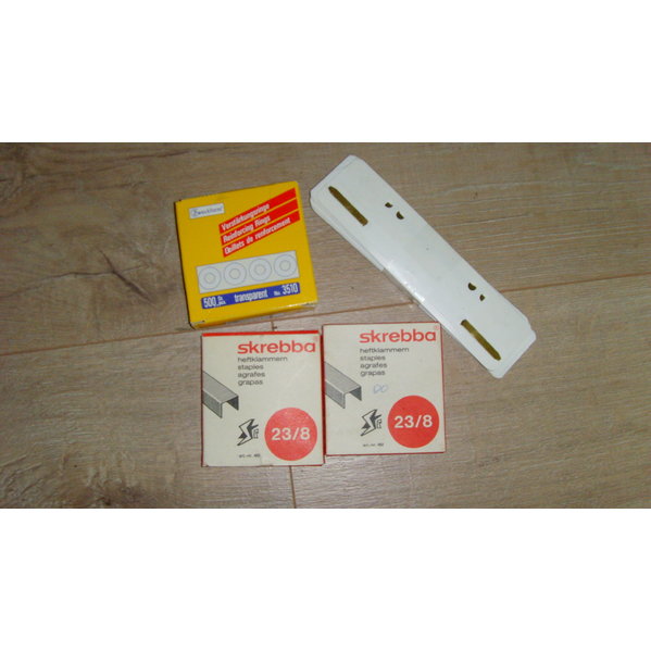 Biete hier zwei Packungen Heftklammern (bei der einen fehlen zwei Reihnen), Größe 23/8, von Skrebba, dazu eine Packung Verstärkungsringe - neu und noch 25 weiße Heftstreifen aus Plastik - siehe Foto