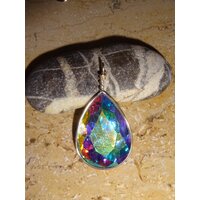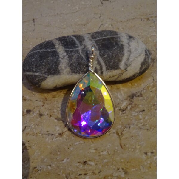Tropfenförmiger Anhänger aus einem facettierten Glasstein, der je nach Blickwinkel und Lichteinfall in den schönsten Farben schimmert. Eine Öse ist bei der Einfassung mit dran, da braucht man nur noch eine Kette oder ein Band durchfädel.