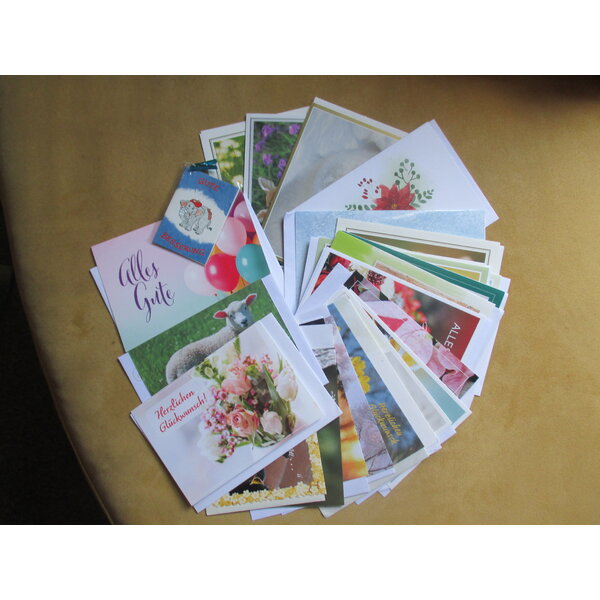 mind. 25 Grußkarten mit Motiven + Umschläge, überwiegend mit Text: Herzliche Grüße, Danke, Glückwunsche, aber auch Ostern und Feiertage, aber auch ohne Text, Tierkarten