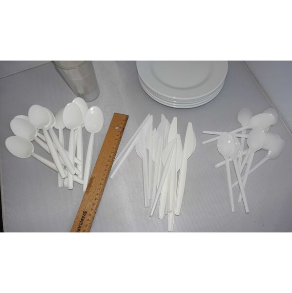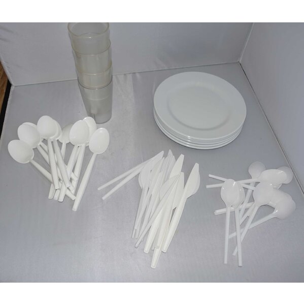 Besteck (eher einfach), dazu 6 sehr stabile teller und 4 transparente Becher. alles Geschirrspülergeeignet, leichte Farbabweichungen möglich