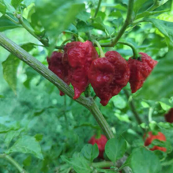 Die rote Carolina Reaper ist für ihre extreme Schärfe und ihr fruchtiges Aroma bekannt. Sie reift von grün zu einem leuchtenden Rot heran und war bis 2023 die schärfste Chili der Welt, mit Spitzenwerten von über 2,2 Millionen Scoville-Einheiten (SHU).