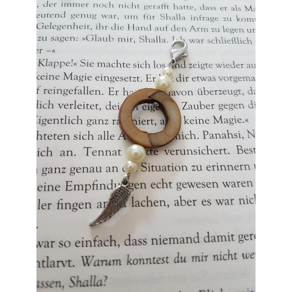 Charm Anhänger, der mit einer runden Perlmuttscheibe, Perlen in verschiedenen Größen und einem Flügel Anhänger geschmückt ist. Der Anhänger ist bestens für Ketten geeignet.