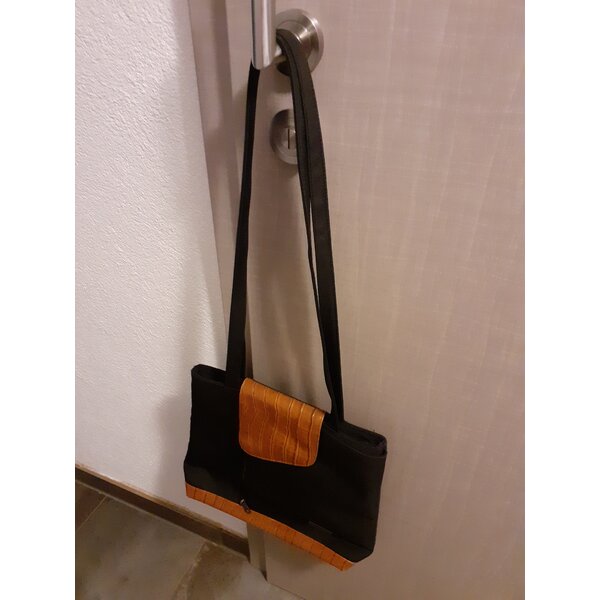 Rückseite schwarz mit noch einem Reissverschlussfach, Boden braun.