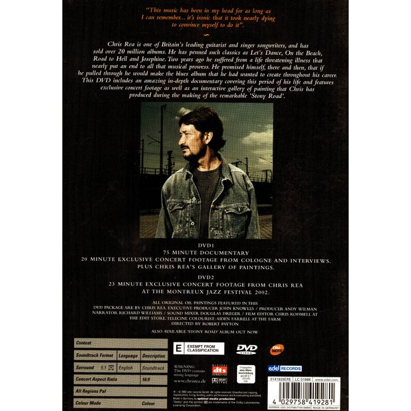 This DVD includes an amazing in-depth documentary covering this period of his life and features exclusive concert footage as well as an interactive gallery of painting that Chris has produced during the making of the remarkable "Stony Road".
