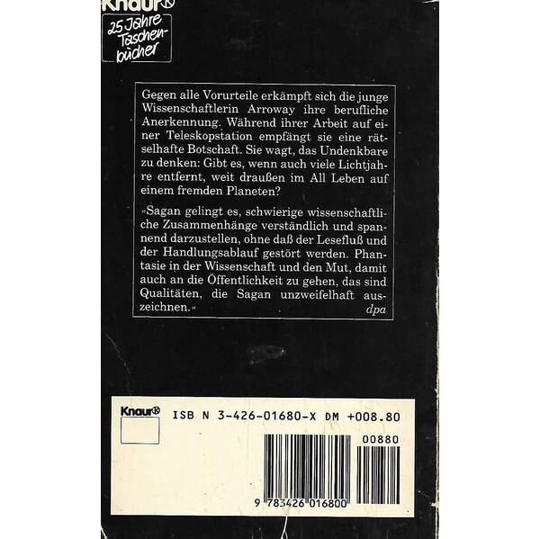 Dies ist der einzige Roman des bekannten Wissenschaftlers Carl Sagan. Darin wird beschrieben, wie auf der Erde ein Signal von Außerirdischen empfangen wird, was jedoch verschlüsselt ist.