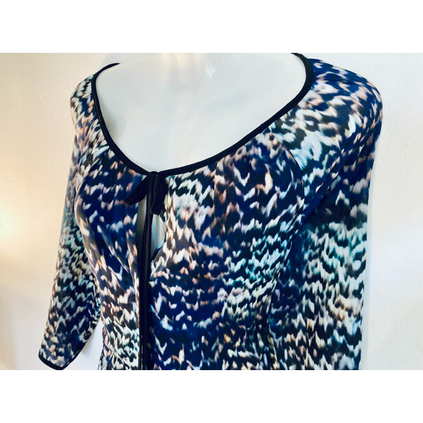 Angenehm fallendes Shirt im Rumpfbereich schwarz unterfüttert mit verdeckter Knopfleiste und dreiviertel Arm. Selten getragen. guter Zustand bis auf eine Stelle am Rücken, siehe letztes Bild mit einigen gezogenen kleinen Fäden