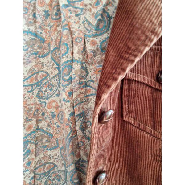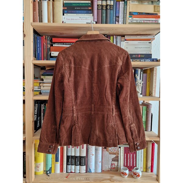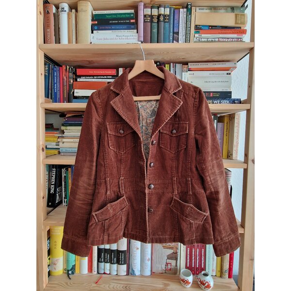 Hübsche, leichte Cordjacke, attraktiv kontrastreiches Innenfutter, zwei Brusttaschen, zwei französische Taschen, Gürtelschlaufen. Kein Gürtel vorhanden.