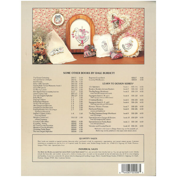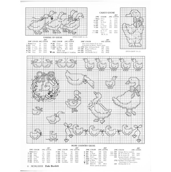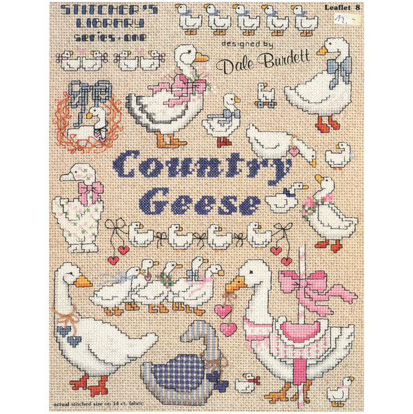 Hier sind auf den Covern etliche Kreuzstich-Arbeiten von Gänsen farbig abgebildet (siehe Bild 1 und 3). Auf den beiden Innenseiten sind die Stickmuster und Farbcodes in schwarz-weiss angegeben.
