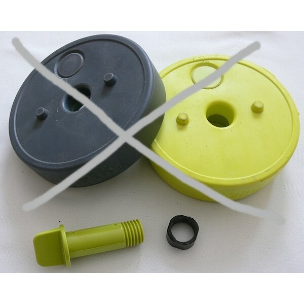 Die Kettlebell war ursprünglich eine 5kg Hantel. Das Oberteil ist ein zusammenhängendes Stück mit 2 kg. Darunter konnte man über ein Plastikgewinde (!!!) jeweils eine 1 kg und eine 2 kg Scheibe schrauben und sie somit von den Kilos her erweitern.