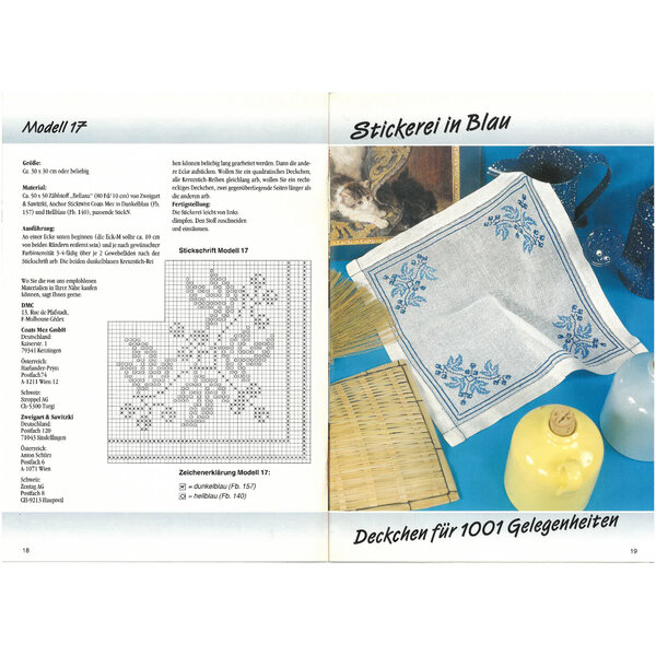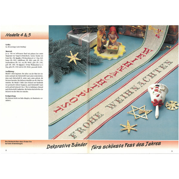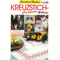 Hier sind viele Kreuzstich-Arbeiten farbig abgebildet. Die Stickmuster und Farbcodes sind in Schwarzweiß zu sehen.