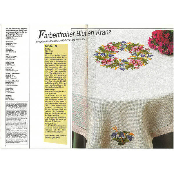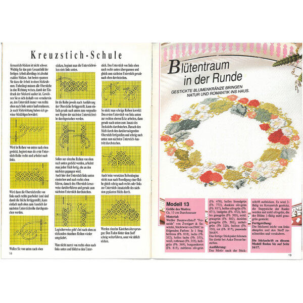 Hier sind viele Kreuzstich-Arbeiten farbig abgebildet. Die Stickmuster und Farbcodes sind in Schwarzweiß und teilweise auch farbig zu sehen.