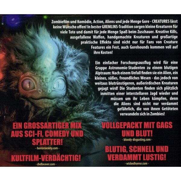 Zombiefilm und Komödie, Action, Aliens und jede Menge Gore: 'Creatures' (2020) lässt keine Wünsche offen. In bester 'Gremlins' Tradition sorgen kleine Kreaturen für viele Tote und damit für jede Menge Spaß beim Zuschauer. Kreative Kills, ausgefallene Waffen, handgemachte Kreaturen und großartige praktische Effekte unter der Regie von Tony Jopia sind in dieser britischen B-Horror-Movie-Produktion nicht nur für Fans von Creature-Features ein Fest, auch Gorehounds kommen auf ihre Kosten.
