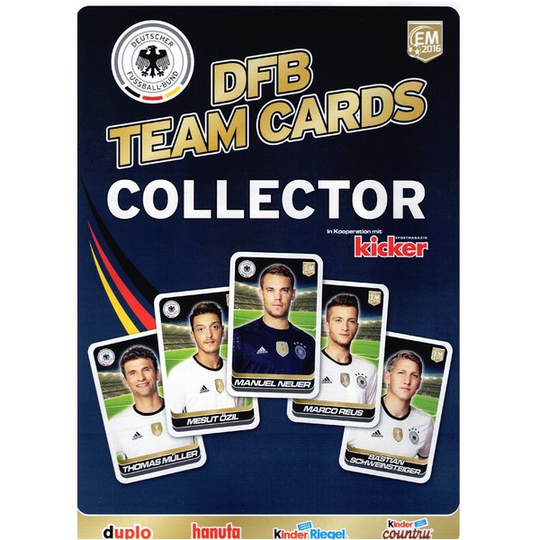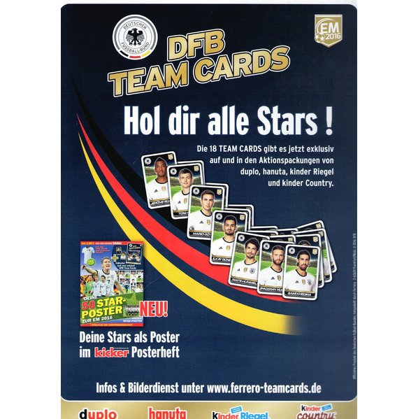 Das Album ist ein Doppelblatt (dickere Seiten ) für 18 TEAM CARDS, die es 2016 in den Aktionspackungen von duplo, hanuta,...gab