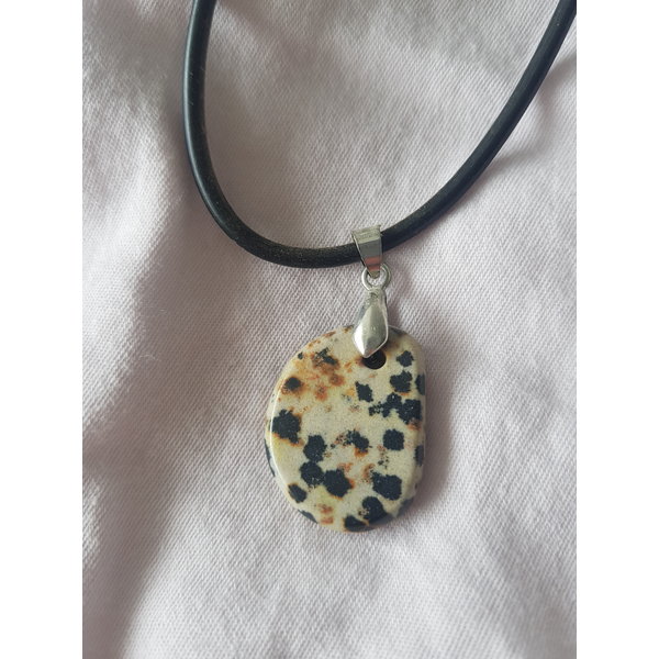 Gefleckter Schmuckstein mit schwarzem Kunststoffband.