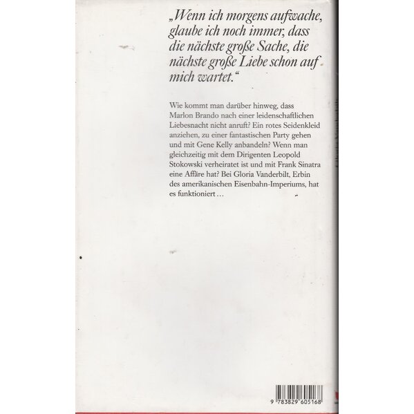 Der Vater stirbt an Alkoholvergiftung, als Gloria 15 Monate alt ist, und vererbt ihr das millionenschwere Familienvermögen. Nach einem spektakulären Sorgerechtsprozess wächst sie bei der strengen Tante, Gründerin des Whitney-Museums, in New York auf, da die Mutter ein lesbisches Verhältnis mit einem Mitglied der englischen Royals hat. Mit siebzehn fliegt sie nach Hollywood, lässt sich von Filmproduzent und Flugpionier Howard Hughes die Welt zeigen, heiratet erst einen gewalttätigen Hollywood- Agenten und dann den 42 Jahre älteren Stardirigenten Leopold Stokowski, beginnt ihre Karriere als Malerin. Freundet sich mit Truman Capote an, der auf dem Klo eine ausgehöhlte Bibel liegen hat, in der ein Päckchen Kokain steckt, Gloria als Holly Golightly in Breakfast at Tiffany’s verewigt und sie dem CBS-Präsidenten Bill Paley als Gespielin schickt...