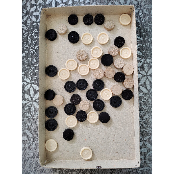 Es sind zwei Sorten Spielsteine dabei: die originalen dazugehörigen aus Plaste und noch ein zusätzlicher Stapel aus Holzsteinen.