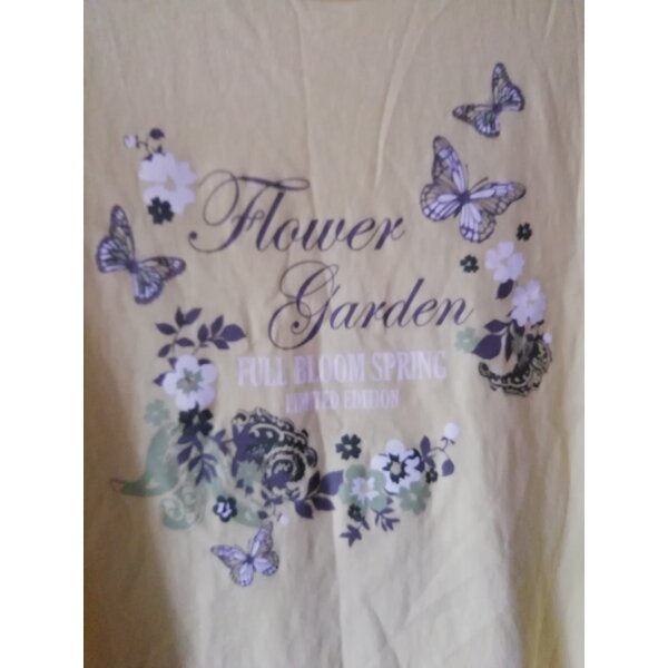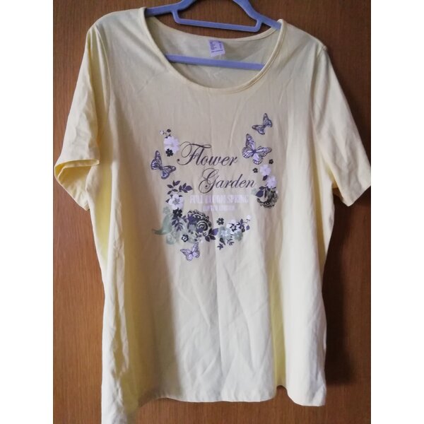 Damen-T-Shirt Gr. 44, Hersteller unbekannt, gelb mit Motiv, 100 % Baumwolle, maschinenwaschbar bis 40 Grad Celsius.