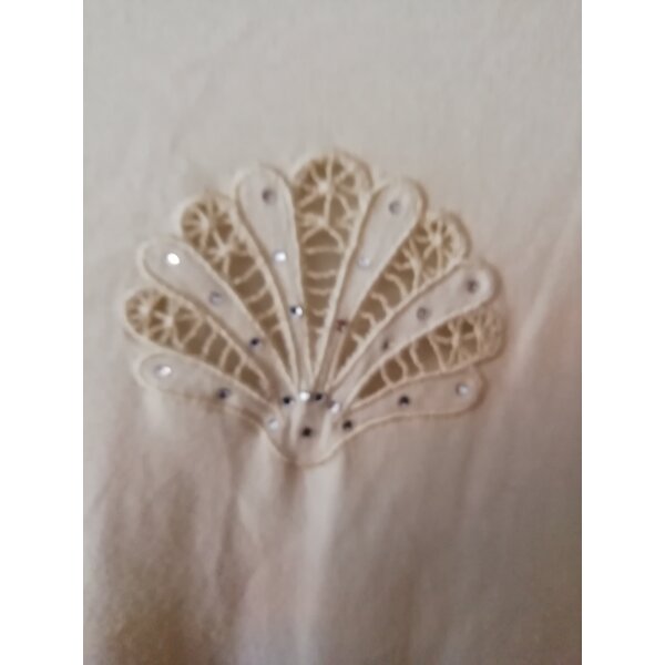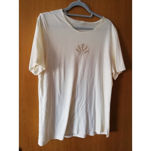 Damen-T-Shirt Gr. 44, Hersteller unbekannt, die Farbe würde ich als ein ganz ganz zartes Gelb bezeichnen, mit hübschem Motiv in Lochstickerei und kurzen Schlitzen an den Seiten, 50 % Baumwolle, 50 % Viskose, maschinenwaschbar bis 40 Grad Celsius.