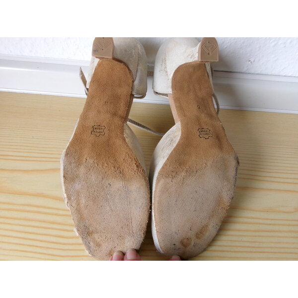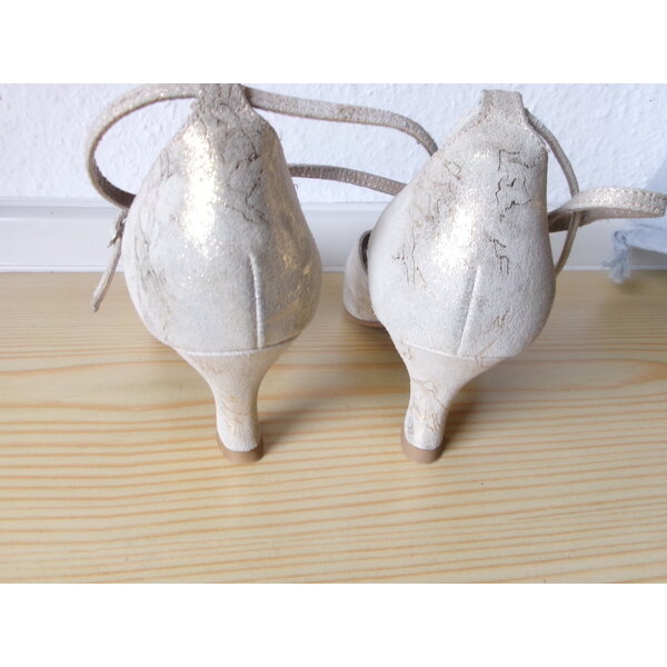 Nur wenig getragene Tanzschuhe mit Riemchen, Absatzhöhe ca. 6 cm. Die Wildledersohle ist intakt. Der Vorderfuß hat goldene Streifen, die durch Gaze durchbrochen sind. siehe Fotos. Absätze wie neu. Schubeutel wird mitgeliefert.