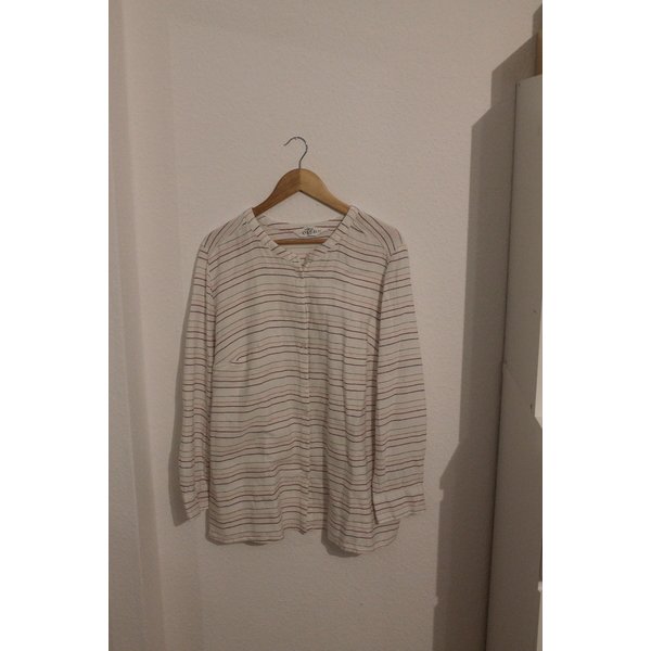 Damenbluse neu in beige mit Streifen und Knopfleiste, EU 48 von Studio Untold, tierfreier Nichtraucherhaushalt, 30° C waschbar, könnte man auch offen tragen mit buntem Top darunter, sieht ein wenig wie gewebt aus von der Struktur