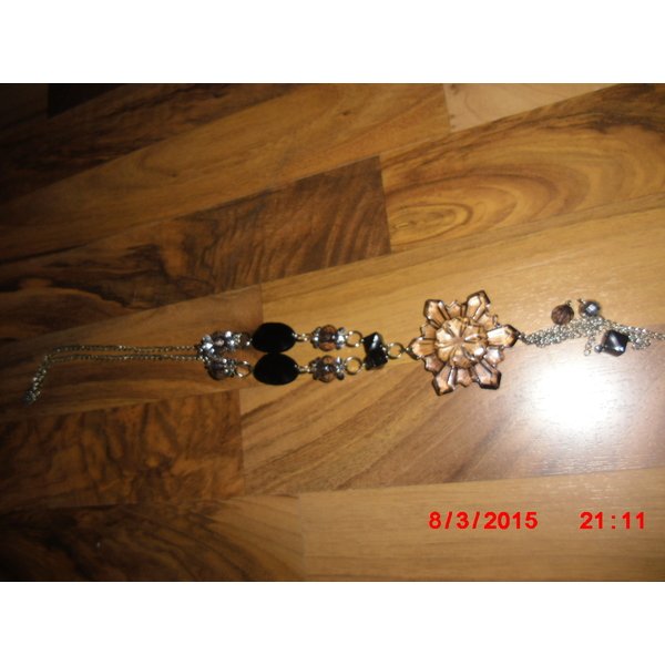 die abgebildete Halskette. Sie ist mindestens 53cm lang. Das Loch für den Kopf ist ca. 35 cm lang. Leider kann ich da keine Angaben zu machen. Es handelt sich wohl um Modeschmuck.