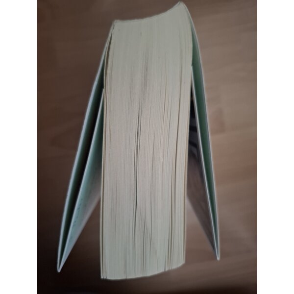 Im Buchrücken befinden sich mehrere ausgeprägte Leseknicke, so dass das Buch insgesamt schief ist, siehe auch die Fotos.