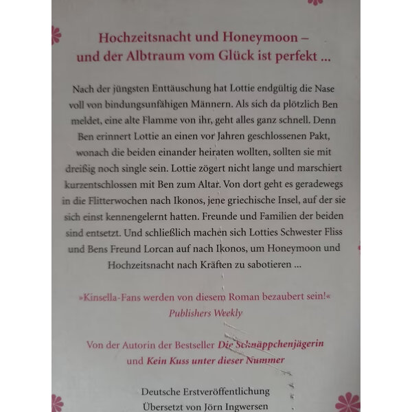Nach der jüngsten Enttäuschung hat Lottie endgültig die Nase voll von bindungsunfähigen Männern. Als sich da plötzlich Ben meldet, eine alte Flamme von ihr, geht alles ganz schnell. Denn Ben erinnert Lottie an einen vor Jahren geschlossenen Pakt, wonach die beiden einander heiraten wollten, sollten sie mit dreißig noch single sein. Lottie zögert nicht lange und marschiert kurzentschlossen mit Ben zum Altar. Von dort geht es geradewegs in die Flitterwochen auf Ikonos, jene griechische Insel, auf der sie sich einst kennengelernt hatten. Freunde und Familien der beiden sind entsetzt. Und schließlich machen sich Lotties Schwester Fliss und Bens Freund Lorcan auf nach Ikonos, um Honeymoon und Hochzeitsnacht nach Kräften zu sabotieren ...
