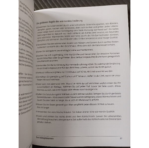Die Chinesische Medizin (TCM) hat eine ganz eigene Sicht auf die Ernährung. Während es in der westlichen Ernährungslehre vor allem um Kohlenhydrate, Fette, Eiweiß, Vitamine und Spurenelemente geht, spielt in der Fünf-Elemente-Ernährungslehre der TCM die thermische Qualität der Lebensmittel eine entscheidende Rolle. Man unterscheidet kalte, kühle, neutrale, warme und heiße Nahrungsmittel. Ein Kältephänomen kann entstehen, wenn viele kühlende Lebensmittel in einer kühlen Umgebung gegessen werden. Salate, Rohkost und vieles mehr gelten bei uns als gesund, entziehen dem Körper aber unbemerkt Wärme. Möglicherweise liegt in einer kühlenden Ernährung die Ursache für Ihr Übergewicht, Ihre chronische Erkrankung oder gar eine Autoimmunerkrankung, für die es scheinbar keine Erklärung gibt...