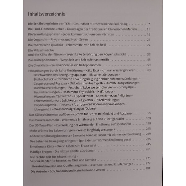 Die Chinesische Medizin (TCM) hat eine ganz eigene Sicht auf die Ernährung. Während es in der westlichen Ernährungslehre vor allem um Kohlenhydrate, Fette, Eiweiß, Vitamine und Spurenelemente geht, spielt in der Fünf-Elemente-Ernährungslehre der TCM die thermische Qualität der Lebensmittel eine entscheidende Rolle. Man unterscheidet kalte, kühle, neutrale, warme und heiße Nahrungsmittel. Ein Kältephänomen kann entstehen, wenn viele kühlende Lebensmittel in einer kühlen Umgebung gegessen werden. Salate, Rohkost und vieles mehr gelten bei uns als gesund, entziehen dem Körper aber unbemerkt Wärme. Möglicherweise liegt in einer kühlenden Ernährung die Ursache für Ihr Übergewicht, Ihre chronische Erkrankung oder gar eine Autoimmunerkrankung, für die es scheinbar keine Erklärung gibt...