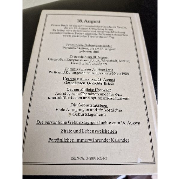 Dieses Buch ist ein ganz persönliches Geschenk für Personen, die am 18.08 Geburtstag habben, Es bringt eine interessante Mischung aus informativen Texten und unterhaltsamen Berichten