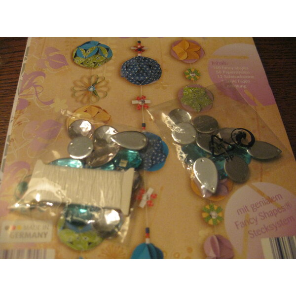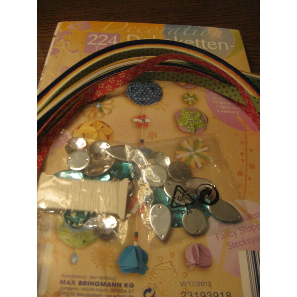 1 x 50 Papierstreifen, 1 x 150 Fancy Shapes, 12 Schmucksteine, 1 Spule Faden, 1 Anleitung. Aus der 2. Packung fehlt ein paar Teile, aber insgesamt fast doppelt vorhanden. Von den Schmucksteinen sind aus der 2. Packung 11 von 12 vorhanden, Bei den Papierstreifen sind 3 ein wenig verknickt und vielleicht fehlen auch ein paar