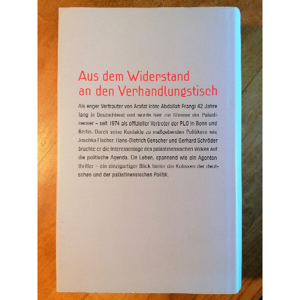 Als enger Vertrauter von Arafat war Abdallah Frangi 42 Jahre lang in Deutschland und wurde hier zur Stimme der Palästinenser – seit 1974 als offizieller Vertreter der PLO in Bonn und Berlin. Durch seine engen Kontakte zu den maßgebenden Politikern brachte er die Interessenlage des palästinensischen Volkes auf die politische Agenda. Er pflegte u. a. Verbindungen zu Hans-Jürgen Wischnewski, Joschka Fischer, Hans-Dietrich Genscher und Gerhard Schröder – ein einzigartiger Blick hinter die Kulissen der internationalen Politik.