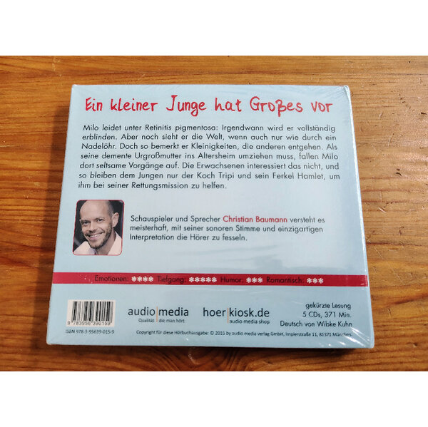 Milo leidet unter Retinitis pigmentosa: Irgendwann wird er vollständig erblinden. Aber noch sieht er die Welt – wenn auch nur wie durch ein Nadelöhr. Doch so bemerkt er Kleinigkeiten, die anderen entgehen. Als seine demente Urgroßmutter ins Altersheim umziehen muss, fallen Milo dort seltsame Vorgänge auf. Die Erwachsenen interessiert das nicht, und so bleiben dem Jungen nur der Koch Tripi und sein Ferkel Hamlet, die ihm bei seiner Rettungsmission helfen …