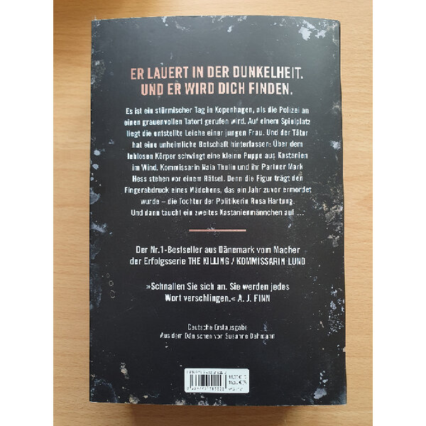 Es ist ein stürmischer Tag in Kopenhagen, als die Polizei an einen grauenvollen Tatort gerufen wird. Auf einem Spielplatz liegt die entstellte Leiche einer jungen Frau. Und der Täter hat eine unheimliche Botschaft hinterlassen: Über dem leblosen Körper schwingt eine kleine Puppe aus Kastanien im Wind. Kommissarin Naia Thulin und ihr Partner Mark Hess stehen vor einem Rätsel. Denn die Figur trägt den Fingerabdruck eines Mädchens, das ein Jahr zuvor ermordet wurde – die Tochter der Politikerin Rosa Hartung. Und dann taucht ein zweites Kastanienmännchen auf …