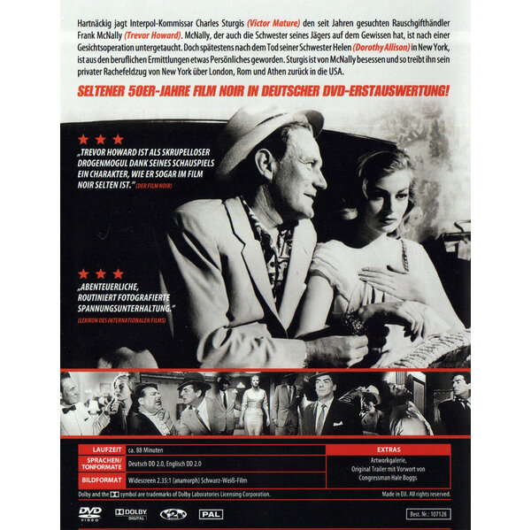 Hartnäckig jagt ein Kommissar von Interpol einen nach einer Gesichtsoperation untergetauchten Rauschgifthändler, der die Schwester seines Verfolgers auf dem Gewissen hat, von New York über London, Rom und Athen zurück in die USA. Abenteuerliche, routiniert fotografierte Spannungsunterhaltung, die unter Vernachlässigung eines einleuchtenden Handlungsgefüges Genreklischees und Schauplätze abwechslungsreich aneinanderreiht. Produzent war Albert R. Broccoli, der später für die James Bond-Filme verantwortlich war.