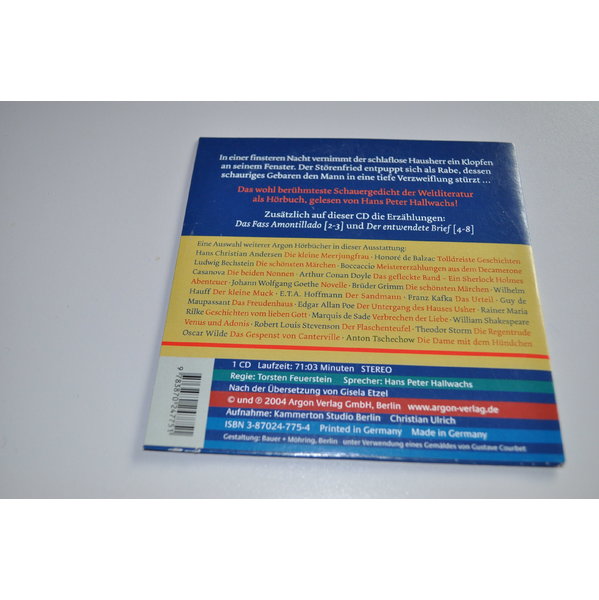 Das wohl berühmteste Schauergedicht der Weltliteratur als Hörbuch. In einer finsteren Nacht vernimmt der schlaflose Hausherr ein Klopfen an seinem Fenster. Der Störenfried entpuppt sich als Rabe, dessen schauriges Gebaren den Mann in tiefe Verzweiflung stürzt.