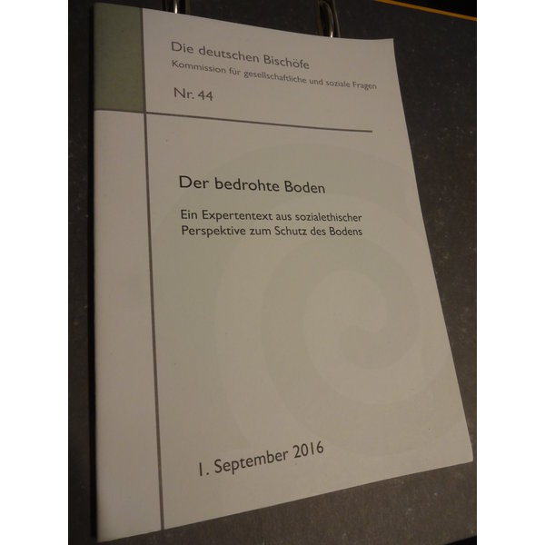 Dass mit ökologischen Herausforderungen Fragen sozialer und intergenerationeller Gerechtigkeit verbunden sind, hat Papst Franziskus in seiner Enzyklika Laudato si’ – Über die Sorge für das gemeinsame Haus eindrücklich dargelegt. Die Kommission für gesellschaftliche und soziale Fragen möchte mit der Veröffentlichung des Expertentextes „Der bedrohte Boden“ für eine stärker am Gemeinwohl und am Prinzip der Nachhaltigkeit orientierte Bodennutzung sensibilisieren und einen Beitrag zur öffentlichen Auseinandersetzung mit diesem Thema leisten." (Quelle: Bischofskonferenz"