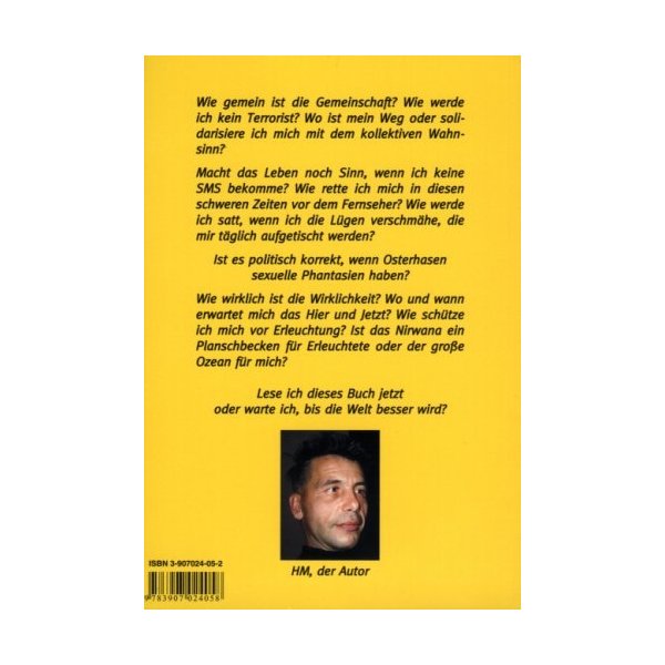Wie gemein ist die Gemeinschaft? Wie werde ich kein Terrorist? Wo ist mein Weg oder solidarisiere ich mich mit dem kollektiven Wahnsinn? Macht das Leben noch Sinn, wenn ich keine SMS bekomme? Wie rette ich mich in diesen schweren Zeiten vor dem Fernseher? Wie werde ich satt, wenn ich die Lügen verschmähe, die mir täglich aufgetischt werden? Ist es politisch korrekt, wenn Osterhasen sexuelle Phantasien haben? Wie wirklich ist die Wirklichkeit? Wo und wann erwartet mich das Hier und Jetzt? Wie schütze ich mich vor Erleuchtung? Ist das Nirwana ein Planschbecken für Erleuchtete oder der große Ozean für mich? Lese ich dieses Buch jetzt oder warte ich, bis die Welt besser wird? E