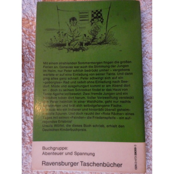 Mit einem strahlenden Sommermorgen fingen die großen Ferien an. Genauso war auch die Stimmung der Jungen im Heim, nur Peter schlich bedrückt umher - vergebens wartete er auf eine Einladung von seiner Tante. Und dann ging alles ganz schnell. Peter schwingt sich au ein "geborgtes" Rad und radelt ohne Einladung nach Seedorf. Müde und ausgehungert kommt er am Abend dort an - doc hzu seinem Schrecken findet er das Haus von Tante Agathe vollbesetzt: Zwei fremde Jungen und ein Mädchen toben dort herum. Voller Verzweiflung versteckt sich heimlich in einer Waldhütte, geht nur anchts schwimmen und brät sich selbstgefangene Fische. Er haus wie ein Indianer und hinterläßt überall geheimnisvolle Spuren. Und doch raucht der "Rote Rächer" eines TAgs mit seinen "Feinden" die Friedenspfeife - ein aufregendes Erlebnis!