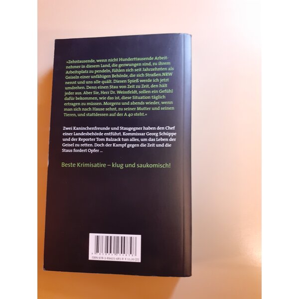 „Zwei Kaninchenfreunde und Staugegner haben den Chef einer Landesbehörde entführt. Kommissar Georg Schüppe und der Reporter Tom Balzack tun alles, um das Leben der Geisel zu retten. Doch der Kampf gegen die Zeit und die Staus fordert Opfer“
