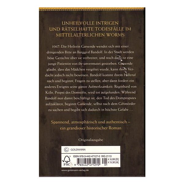 Worms 1067. Die Heilerin Garsende wendet sich mit einer dringenden Bitte an Burggraf Bandolf. Eine Patientin ist unvermutet gestorben, und in der Stadt werden böse Gerüchte über die Heilerin verbreitet. Garsende glaubt, dass das Mädchen vergiftet wurde, kann ihren Verdacht jedoch nicht beweisen. Bandolf kommt ihrer Bitte gerne nach und fängt an, Fragen zu stellen, aber dann fordert ein anderes Ereignis seine ganze Aufmerksamkeit: Reginhard von Köln, Propst des Domstifts, wird tot aufgefunden. Garsende beginnt nun selbst mit Nachforschungen und kommt einer gefährlichen Intrige auf die Spur ...