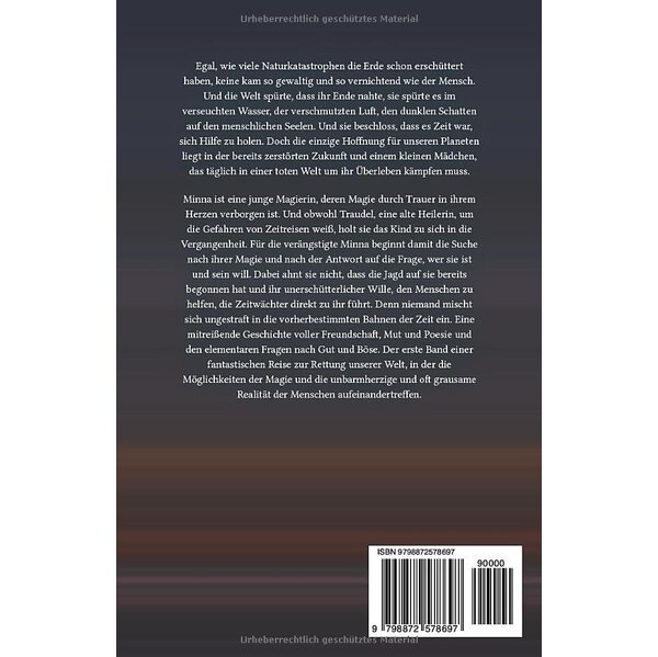 Minna ist eine junge Magierin, deren Magie durch Trauer in ihrem Herzen verborgen ist. Und obwohl Traudel, eine alte Heilerin, um die Gefahren von Zeitreisen weiß, holt sie das Kind zu sich in die Vergangenheit. Für die verängstigte Minna beginnt damit die Suche nach ihrer Magie und nach der Antwort auf die Frage, wer sie ist und sein will. Dabei ahnt sie nicht, dass die Jagd auf sie bereits begonnen hat und ihr unerschütterlicher Wille, den Menschen zu helfen, die Zeitwächter direkt zu ihr führt. Denn niemand mischt sich ungestraft in die vorherbestimmten Bahnen der Zeit ein. Eine mitreißende Geschichte voller Freundschaft, Mut und Poesie und den elementaren Fragen nach Gut und Böse. Der erste Band einer fantastischen Reise zur Rettung unserer Welt, in der die Möglichkeiten der Magie und die unbarmherzige und oft grausame Realität der Menschen aufeinandertreffen.