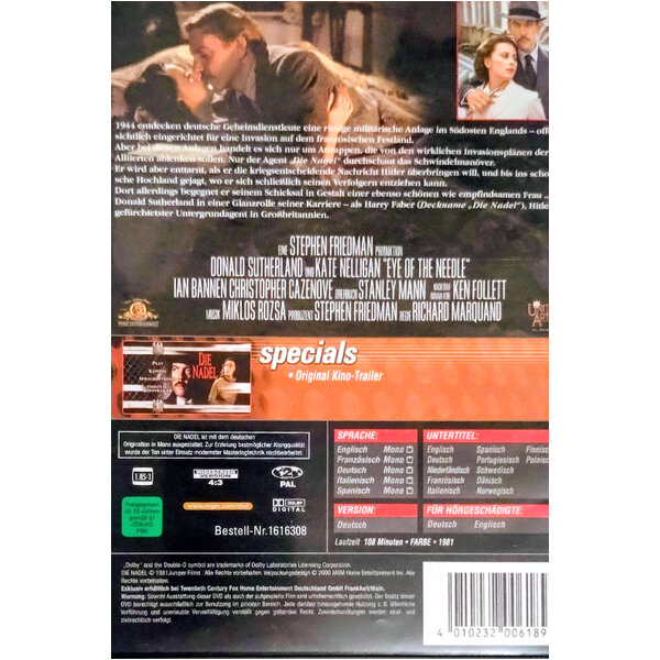 Hitlers gefürchtetster Untergrund-Agent Henry Faber - Deckname: "Die Nadel". 1944 entdeckten deutsche Geheimdienste eine riesige militärische Anlage im Südosten Englands mit Kasernen, Flugzeug-Landebahnen und einer ganzen Schiffsflotte - offensichtlich eingerichtet für eine Invasion auf dem französischen Festland via Calais. Aber bei diesen Anlagen handelt es sich nur um Attrappen, die von den wirklichen Invasionsplänen der Alliierten in der Normandie ablenken sollten. Nur der Agent "Die Nadel" durchschaut ihr Schwindelmanöver, wird freilich enttarnt, als er die kriegsentscheidende Nachricht Hitler überbringen will, und über London und Norfolk bis ins schottische Hochland gejagt, wo er sich schließlich seinen Verflolgern entziehen kann. Dort allerdings begegnet er seinem Schicksal in Gestalt einer ebenso schönen wie empfindsamen Frau...