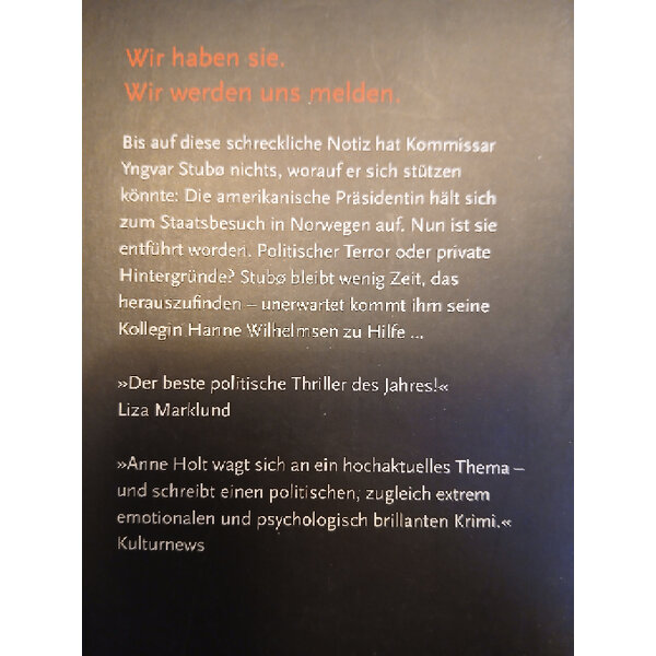 Bis auf diese schreckliche Notiz hat Kommissar Yngvar Stubø nichts, worauf er sich stützen könnte: Die amerikanische Präsidentin hält sich zum Staatsbesuch in Norwegen auf. Nun ist sie entführt worden. Politischer Terror oder private Hintergründe? Stubø bleibt wenig Zeit, das herauszufinden – unerwartet kommt ihm seine Kollegin Hanne Wilhelmsen zu Hilfe …